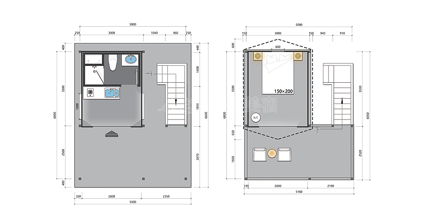 SYE30帐篷主体 5m6m,L1/L2 室内面积分别为 9.8㎡、9.2㎡,在 A15 基础上增设一层形成独特阁楼设计:一楼设浴室、厨房与用餐区,二楼 3.5m2.8m 作卧室,既提升居住私密性又拓展空间,为户外生活添趣。上下均带阳台,配两把躺椅与小桌,适配小家庭休憩;其不仅是帐篷,更能引领客户体验阁楼式户外生活新高度。