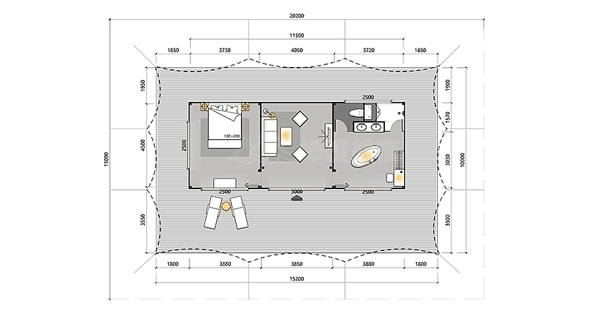 室内面积:53㎡ 结构材料:进口-樟子松 国标阻燃,防潮防霉