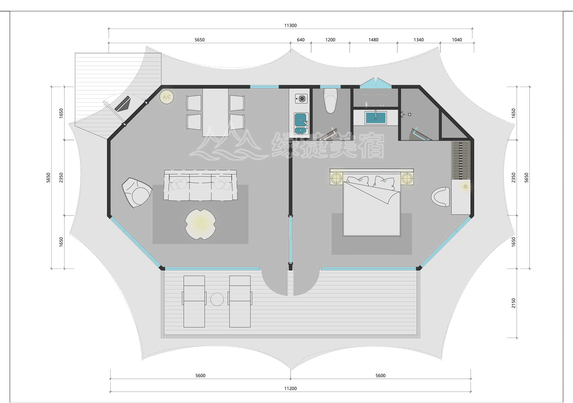 SYH58帐篷以 5.6m×11.3m 的主体尺寸为基础,为内部空间预留了充足的规划灵活性 —— 既能巧妙划分出卧室、休息区与洗浴设施,又能始终保持整体空间的宽敞感与舒适感,满足多样居住需求。在篷布设计上,我们采用双层顶篷结构:一方面,这种结构本身更具稳固性,能更好地抵御强风等自然条件的考验,有效延长帐篷使用寿命;另一方面,还可根据实际需求灵活调整通风效果与隔热层,提供更多适配选项,轻松应对不同季节与气候的变化。