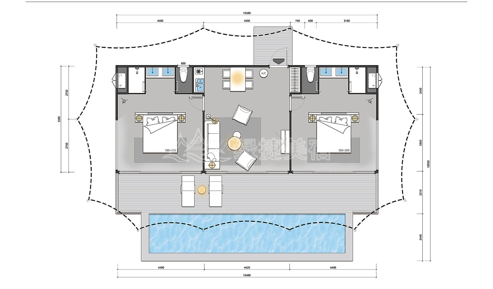 凭借 5.5m×13.5m 的主体尺寸优势,SYM74 酒店帐篷内部拥有足够空间来灵活布置各类豪华住宿设施,轻松适配家庭出游、朋友聚会等不同场景的需求。而帐篷外的配套设计同样贴心:专属小露台是亲近自然的绝佳角落,客户可在此品茶、阅读或与友人闲聊,静享自然风光;露台前方的小泳池,更是为体验加分 —— 夏日可驱暑降温,凉夜能享受惬意,让户外时光更添舒适。值得一提的是,帐篷顶部的三峰设计兼具颜值与实用性:简约大方的造型提升整体美观度,优异的排水性能则能应对恶劣天气,确保客户始终拥有稳定、舒适的居住体验。