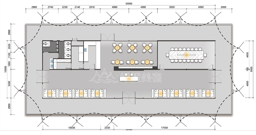SYY300 帐篷为单顶张拉膜酒店款,PVDF 顶膜耐候防水,寿命达 25 年 +;三侧双层中空玻璃隔音保温,背面仿木鱼鳞板抗腐美观。5 星酒店套房设计,1-2 居阔绰空间可商住,饰材含塑木 / PVC 墙板等,配多层实木地板与奢华露台,新风、智能系统、地暖等现代家居可一站式配齐。